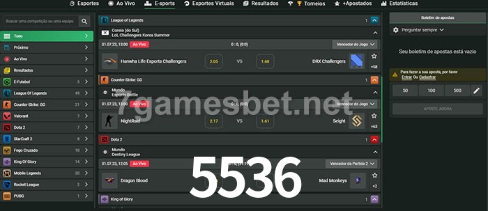 O 5536 oferece uma grande seleção de opções de apostas em e-sports com probabilidades competitivas